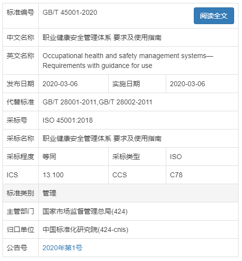 標準號 :GB/T 45001-2020發布日期:2020-03-06實施日期:2020-03-06全部代替標準:GB/T 28001-2011,GB/T 28002-2011中國標準分類號:C78國際標準分類號:13.100歸口單位:中國標準化研究院執行單位:中國標準化研究院主管部門:國家市場監督管理總局。