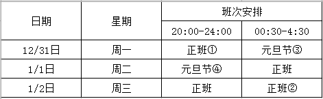 以2019年元旦節(jié)為例。法定節(jié)假日是1月1日,周二工作日。如下圖實(shí)例,正班①②為晚班員工的正班工作時(shí)段,工廠如未安排員工上班,需支付停工待料工資。元旦節(jié)③4為法定節(jié)假日,如安排員工休息,支付正班工資。